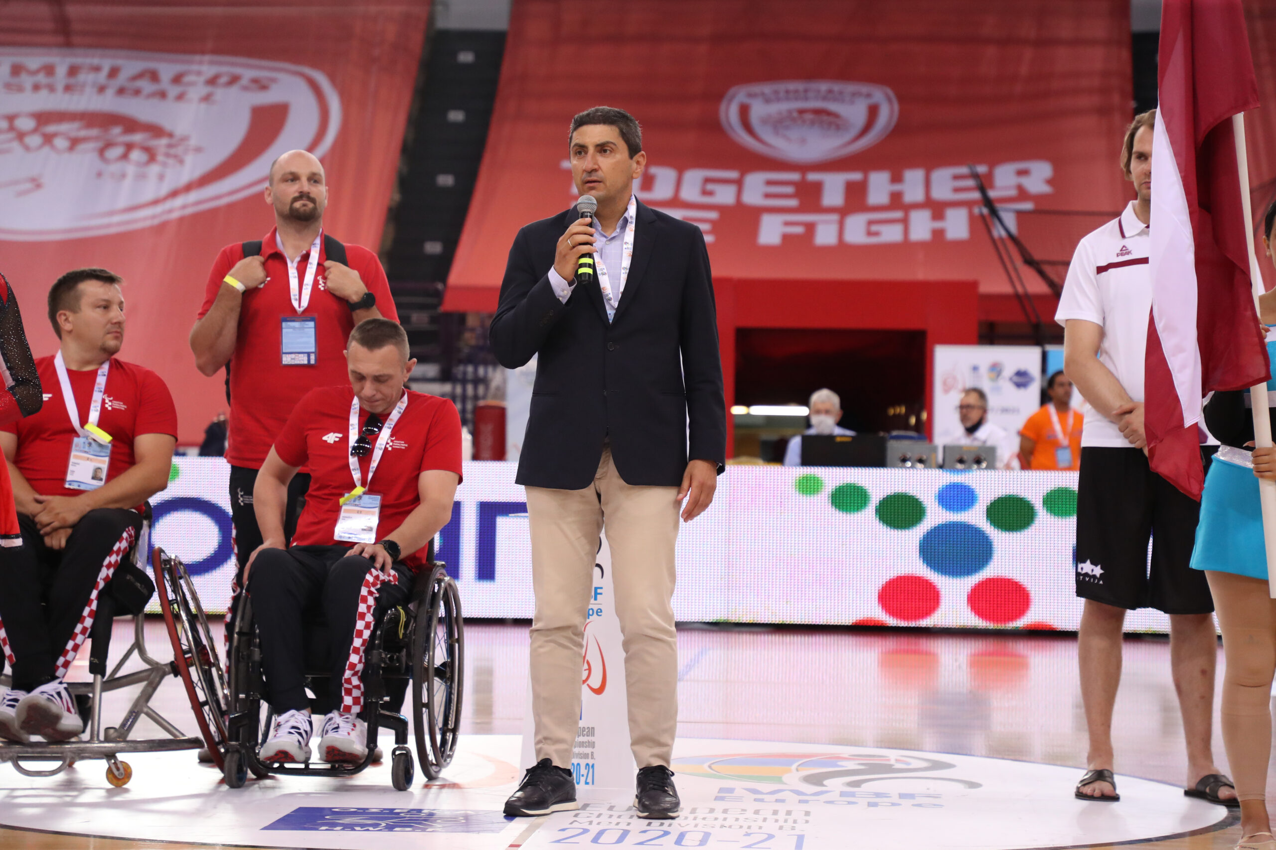 «Σας καλωσορίζουμε στην Ελλάδα. Σας καλωσορίζουμε σε ένα από τα ομορφότερα τοπόσημα του αθλητισμού και του πολιτισμού της χώρας μας. Σε μια μεγάλη διοργάνωση που έχουμε τη χαρά να φιλοξενούμε εδώ. Χαιρετίζουμε τις πρωτοβουλίες και τη δράση της νέας Διοίκησης της Παραολυμπιακής Επιτροπής της χώρας μας και της ΟΣΕΚΑ. Εύχομαι σε όλους υγεία, καλή δύναμη, επιτυχίες και επιστροφή στην κανονικότητα το συντομότερο δυνατόν, με μεγάλες διοργανώσεις με πολύ κόσμο στις κερκίδες. Αυτή η φορά είναι μια εξαίρεση. Ελπίζουμε σύντομα όλα αυτά να είναι παρελθόν».