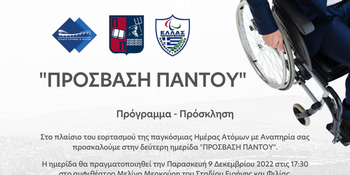 Την Παρασκευή 9 Δεκεμβρίου θα πραγματοποιηθεί η Ημερίδα «Πρόσβαση Παντού» στη συνεδριακή αίθουσα του Σταδίου Ειρήνης και Φιλίας.