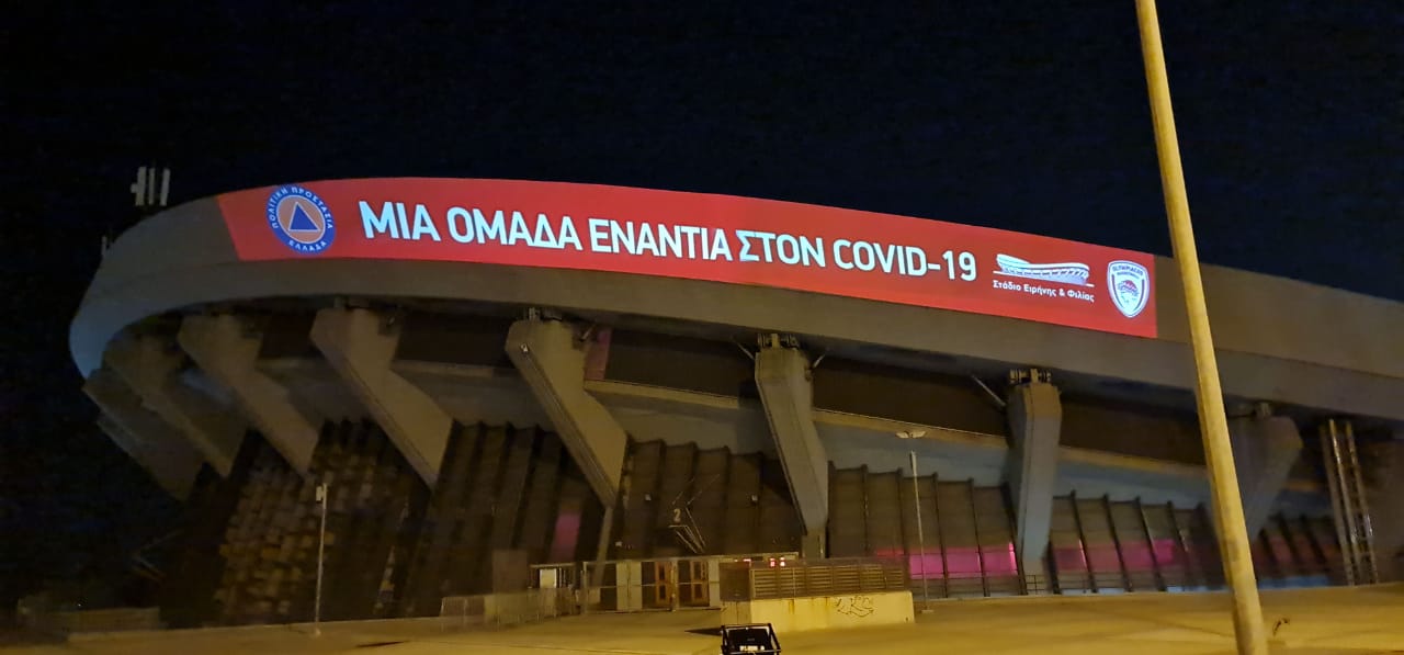 Ηχηρό μήνυμα ενότητας στη μάχη ενάντια στην πανδημία στέλνουν η Γενική Γραμματεία Πολιτικής Προστασίας, το Στάδιο Ειρήνης και Φιλίας και η ΚΑΕ Ολυμπιακός με το σύνθημα «Μια ομάδα ενάντια στον COVID-19».