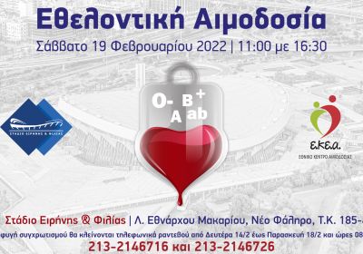 Eθελοντική αιμοδοσία στις 19 Φεβρουαρίου στον περιβάλλοντα χώρο του Σταδίου Ειρήνης και Φιλίας.