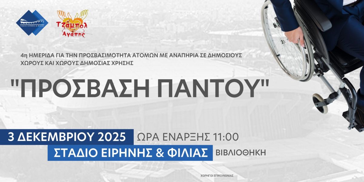 Το Στάδιο Ειρήνης και Φιλίας διοργανώνει την Τετάρτη 3 Δεκεμβρίου, στις 11:00, στο Φουαγιέ της αίθουσας «Μελίνα Μερκούρη», την 4η Ημερίδα «Πρόσβαση Παντού», έναν θεσμό που έχει αναδειχθεί σε σημείο αναφοράς για την προώθηση της ισότιμης πρόσβασης των ατόμων με αναπηρία στην κοινωνία, τον αθλητισμό, την εκπαίδευση και τον δημόσιο χώρο.